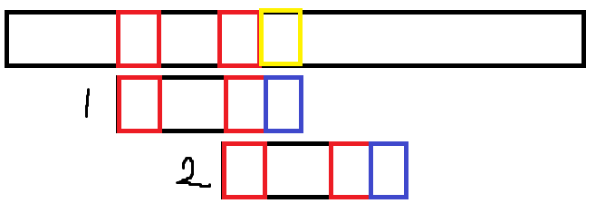 그림으로 나타내면 다음과 같습니다. 노란색과 파란색의 매칭에 실패했을 때 가운데 부분을 건너뛰고 동일한 빨간 부분부터 탐색할 수 있는 것입니다.